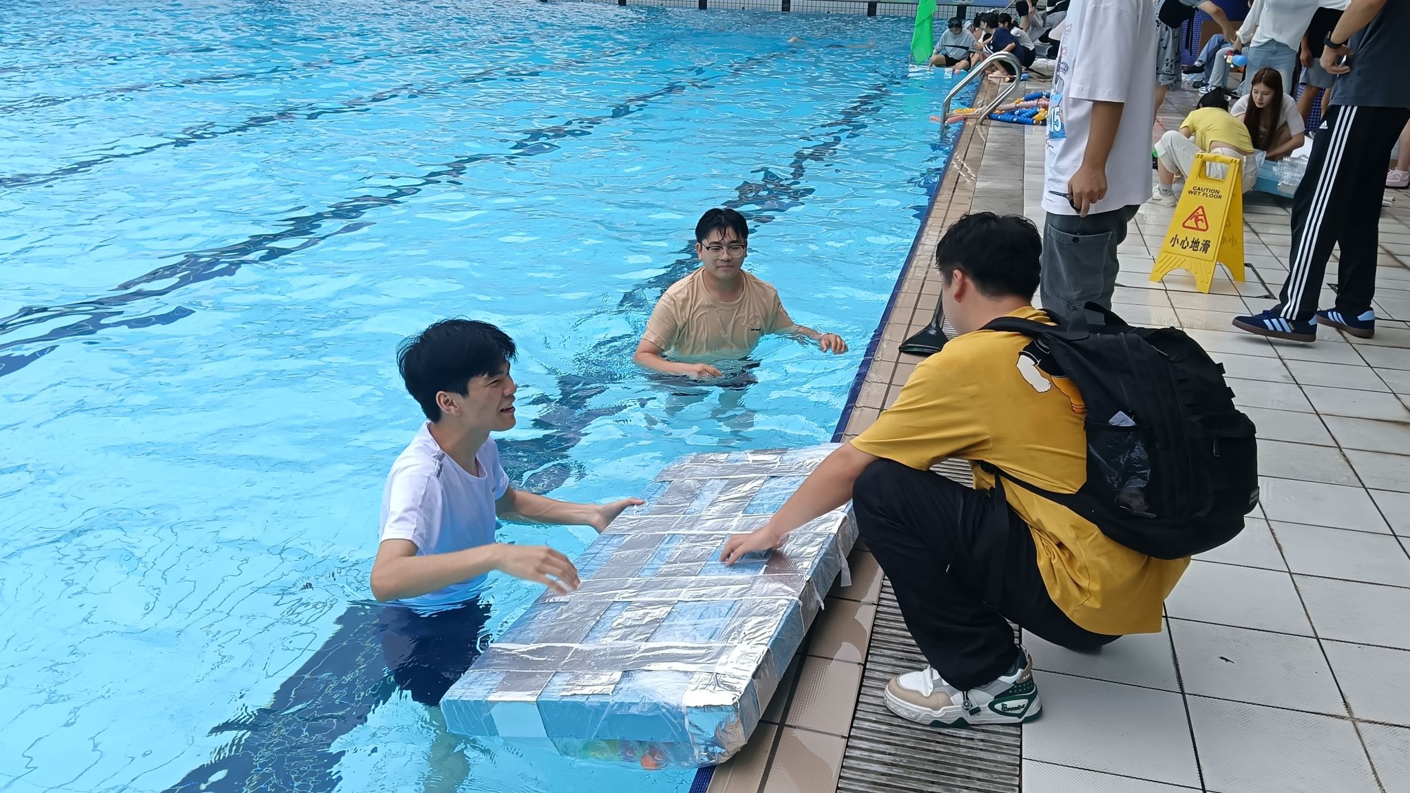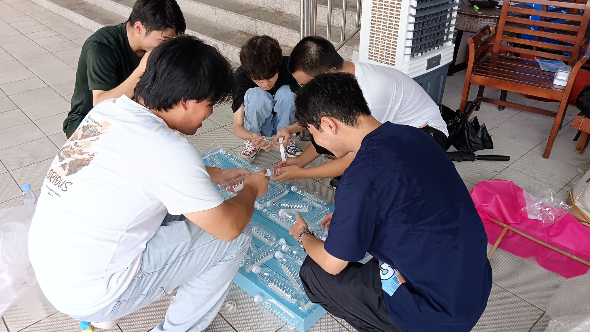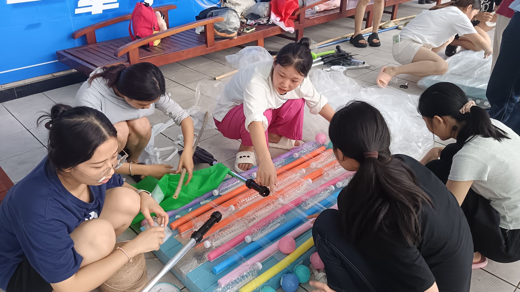 同学们各显神通——从船体结构、材料拼装到外观美化,处处体现团队的智慧与默契。有的用塑料瓶搭浮力底座,有的用废纸板做船舱,还有团队加装自制破水装置,工程思维十足。过程中,讨论声、笑声与加油声此起彼伏,创意与实践不断碰撞。有团队用废旧横幅塑料膜解决防水问题,另一组则将塑料瓶扣在船底防摩擦,真正践行“变废为宝”。