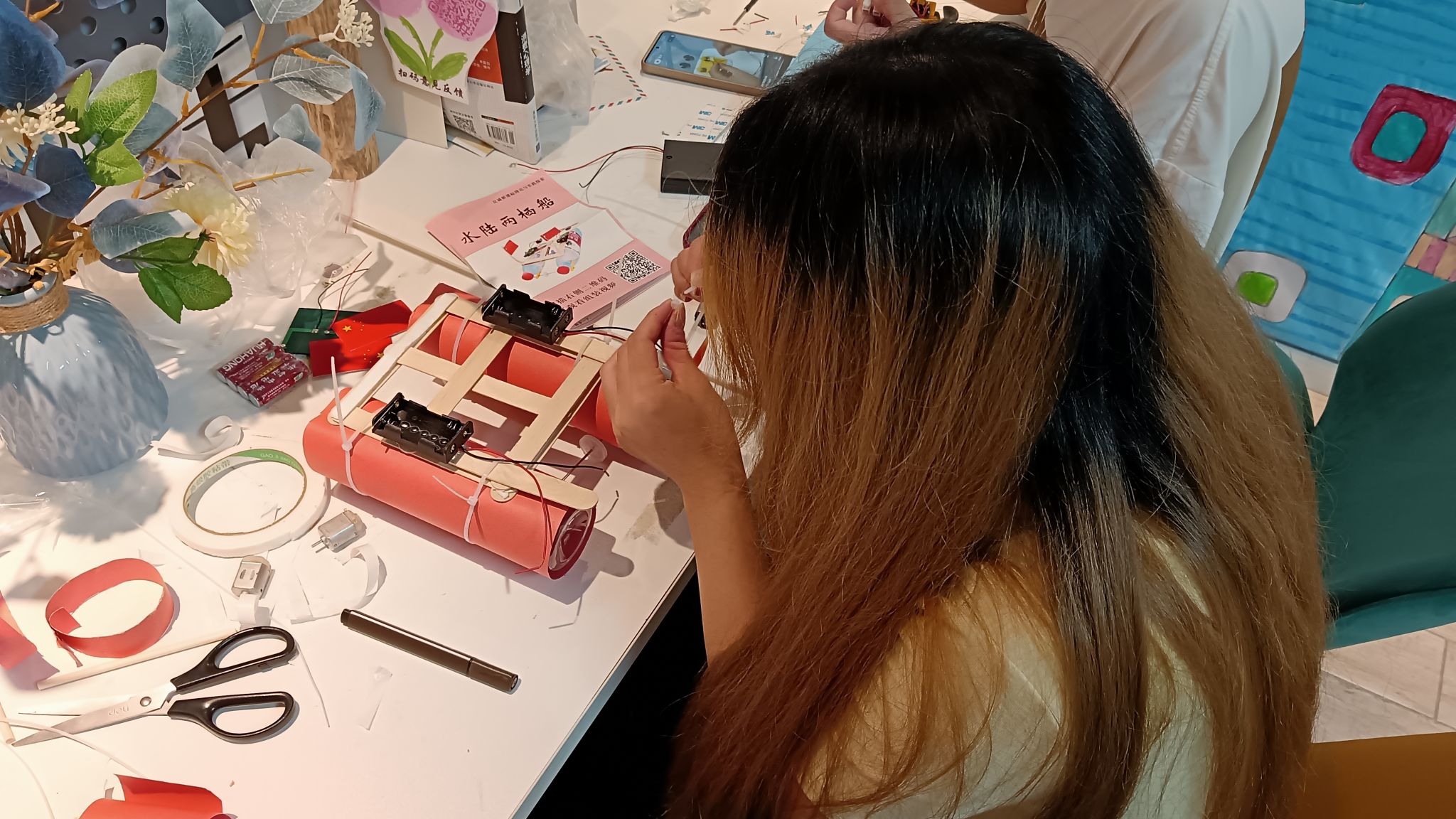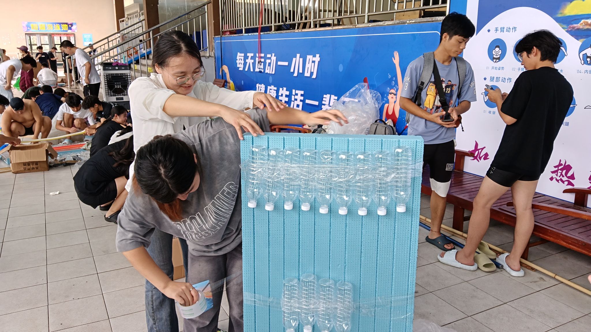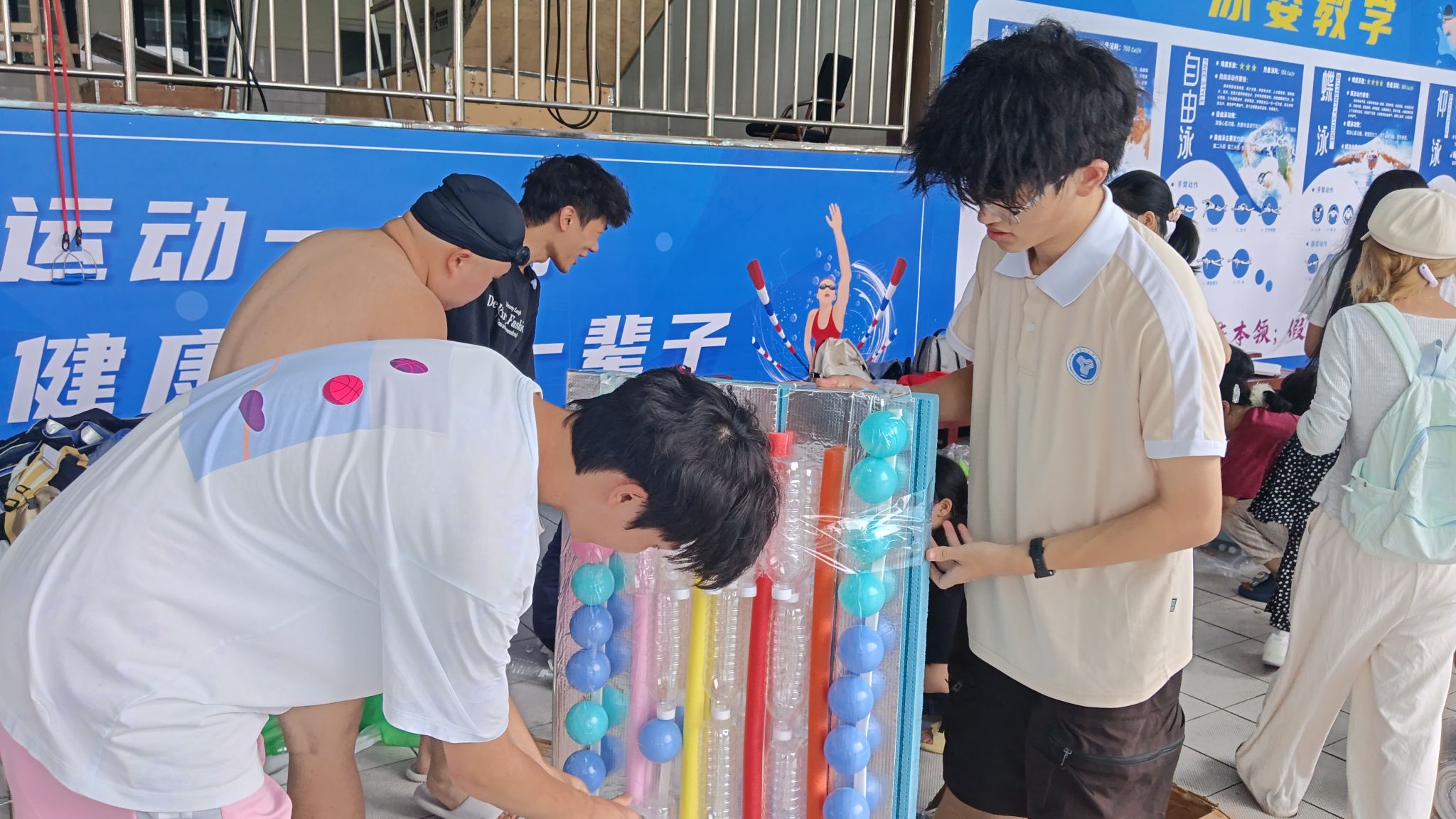 同学们各显神通——从船体结构、材料拼装到外观美化,处处体现团队的智慧与默契。有的用塑料瓶搭浮力底座,有的用废纸板做船舱,还有团队加装自制破水装置,工程思维十足。过程中,讨论声、笑声与加油声此起彼伏,创意与实践不断碰撞。有团队用废旧横幅塑料膜解决防水问题,另一组则将塑料瓶扣在船底防摩擦,真正践行“变废为宝”。