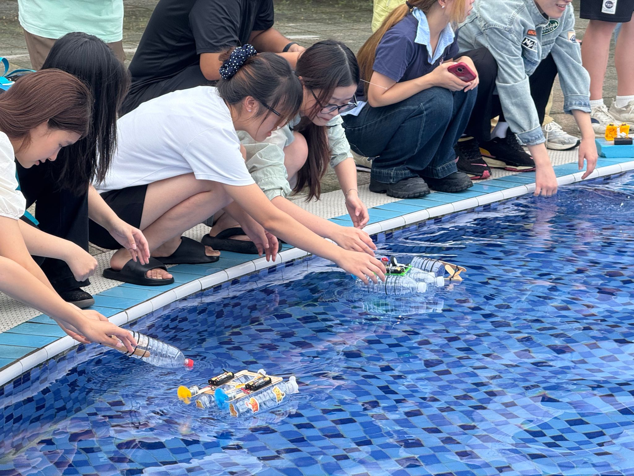 本次活动联合工创工坊打造动力小船设计与竞速平台,鼓励学生运用提供的小型马达、齿轮组及自备材料,自主装配可稳定航行的小船。制作中,同学们团队协作,调试动力、船体及水密处理,并通过试水不断优化,践行“做中学、试中进”。最终十余艘创意小船亮相,各具特色,充分展现理论向实践的转化,体现书院融合科技、创新与教育的探索。