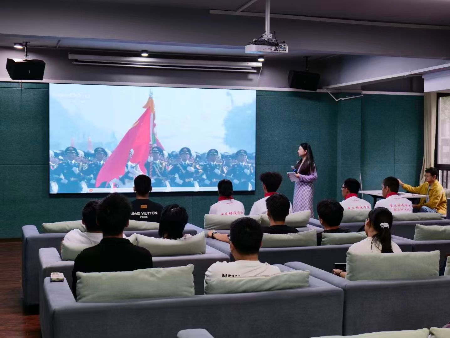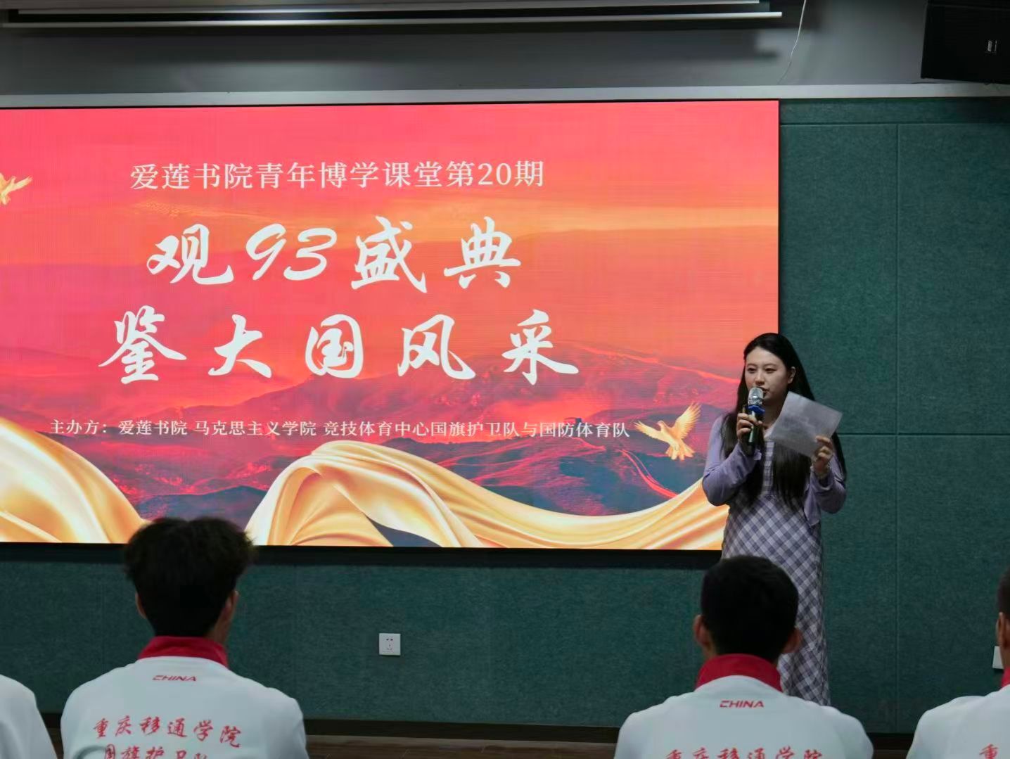 秋高气爽,丹桂飘香。2025年9月26日下午15:30,重庆移通学院爱莲书院多功能影音室内庄重而热烈,以“观九三盛典,鉴大国风采”为主题的青年博学课堂第20期在此隆重举行。本次活动爱莲书院联动联动马克思主义学院、竞技体育中心国旗护卫队与国防体育队,通过“理论引导+视听沉浸+体能实践+情感共鸣”的多维育人模式,围绕九三阅兵这一国家盛事展开深度解读与体验,旨在引导青年学子在回望历史中坚定信仰,在鉴赏盛典中提升审美,在实践参与中强化担当,紧密结合书院“鉴赏力”培养目标,将国家叙事转化为可感、可思、可践行的育人资源,成为一堂融爱国主义教育、审美素养提升与身体实践训练于一体的综合素养课。