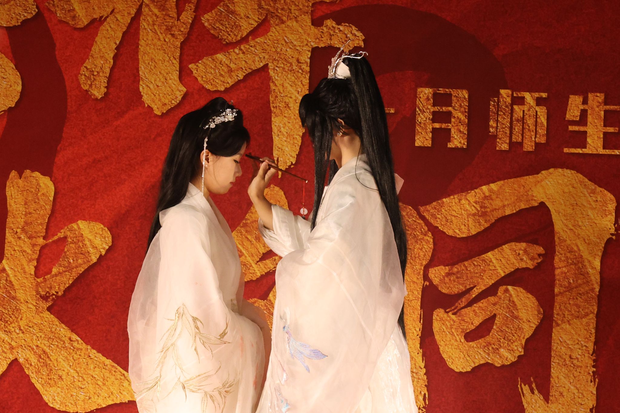 茶香氤氲间,一场由华韵汉服协会带来的“汉服华章”走秀,引领众人步入华夏衣冠的锦绣长廊。同袍们身着各式典雅汉服,手持团扇、书卷,步履从容,风姿卓然,生动展现了“衣冠上国”的礼仪之美与文化自信。紧接着,承载着尊师重道传统的“朱砂启慧”仪式庄重举行。教师寿星代表手持朱笔,在学生寿星代表的眉心轻轻点落嫣红。“朱砂落额,智慧顿开;愿此丹心一点,照亮学途万里。”一点一落间,是智慧的启迪,亦是师者深深的期许。学生代表则奉上清茶,以谢师恩。“一盏清茶,浓缩无限感恩;茶香氤氲,浸润师生情深。”这一刻,师道在书院得到了温暖的传承与诠释。