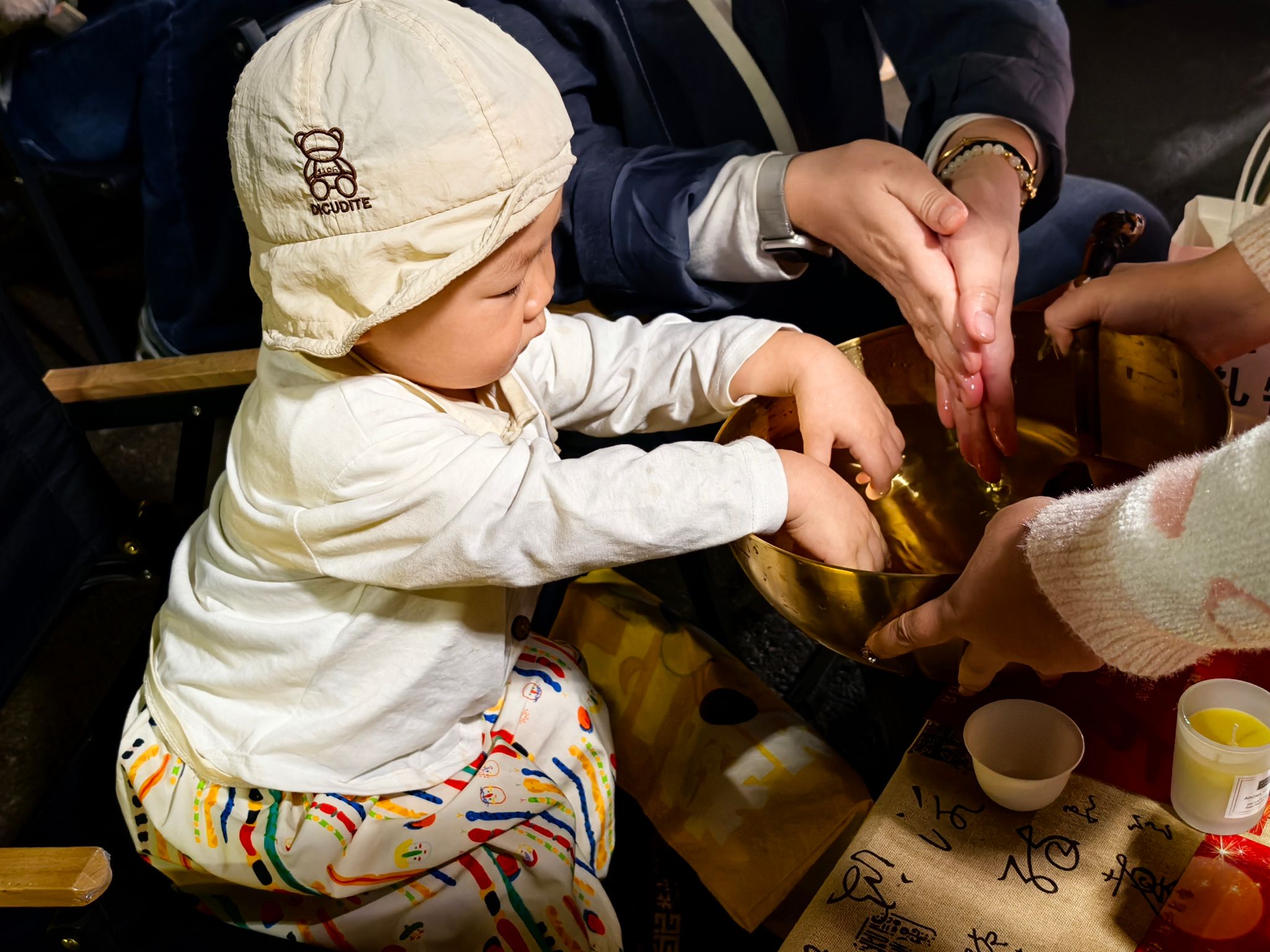 暮色初合,华灯初上。晚七时许,寿星师生们在悠扬的国风雅乐中陆续入场。于入口处依古礼行“沃盥”之仪,清水涤尘,诚心净意,象征着以一颗澄澈明净之心迎接佳辰。顷刻间,锣鼓喧天,气势恢宏,一场精彩的醒狮表演将现场气氛瞬间点燃。在庄重的点睛环节,寿星代表张旭老师和田雲鑫同学手执朱砂笔,为祥狮赋予灵气与生命。“一点左眼,灵气满身;二点右眼,福气盈门!”伴随着洪亮的祝祷,被点亮的瑞兽腾挪起舞,将吉祥与喜庆洒满现场的每一个角落,也正式拉开了生日会的华彩序幕。