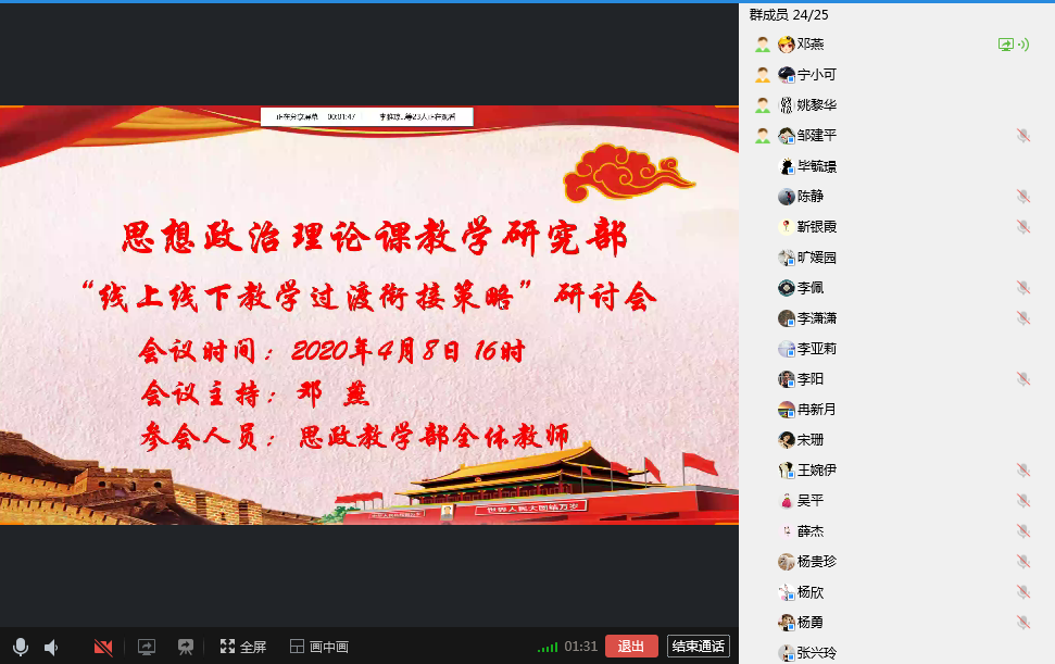 春意阑珊,万物复苏。随着全国疫情形势持续向好,师生重返校园的日子也快到来。为保障线上教学效果,结合当前实际,切实做好线上、线下教学的有效衔接工作,思政教学部于4月8日下午16时,线上举行了“线上线下教学过渡衔接策略”研讨会,会议由教学部主任邓燕主持,思政教学部全体教师参加。