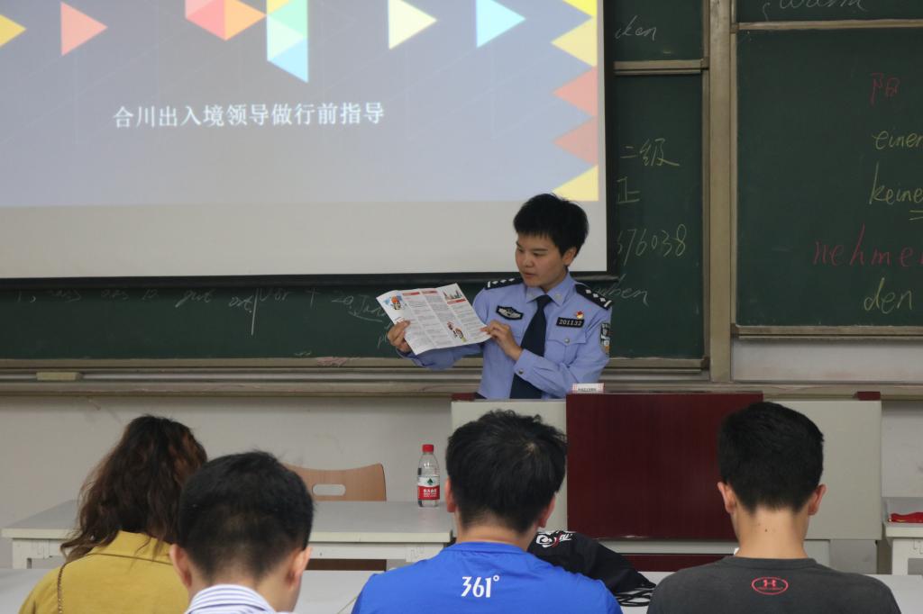 为保障我校国际交流项目各个环节的顺利推进,为师生出国交流提供安全保障,全方位做好各项服务,国际交流与合作处于2019年9月25日下午16:00在6207教室组织召开了“2019年秋季出国交流团行前教育培训会”。此次培训会特别邀请到重庆市合川区公安局出入境管理局的警官们为出国交流的师生们进行在外安全培训和指导。
