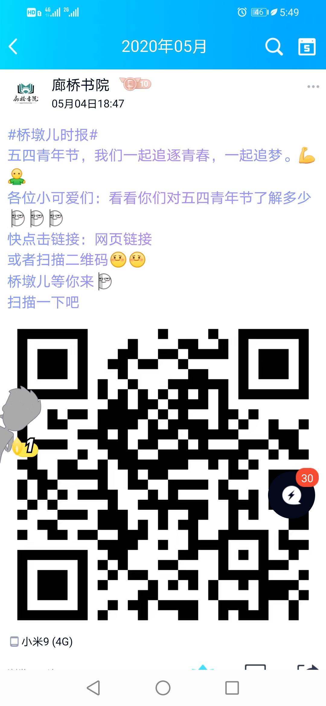 为弘扬五四精神,5月4日--7日,廊桥书院与书院学子通过线上连声,结开展以“五四青年节”为主题的“五四青年”线上知识竞赛、青年活力风采展示等,旨在引导广大青年深入学习贯彻落实新时代中国特设社会主义思想和党的十九大精神。