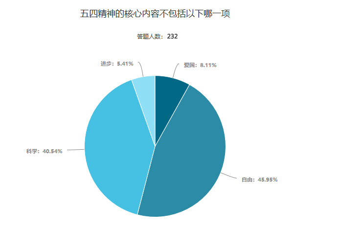 廊桥书院通过线上与书院学子一起学习当代青年大学生应如何树立健康向上的精神风貌。在知识竞答环节,将五四运动的相关知识融入竞答环节中,共计232人参与本次竞答,通过线上答题报告显示出,大部分的学生对相关知识了解较多,通过回顾和发扬“五四”精神,引导青年学子认真思索,在未来应当拥有一个怎样的青春。