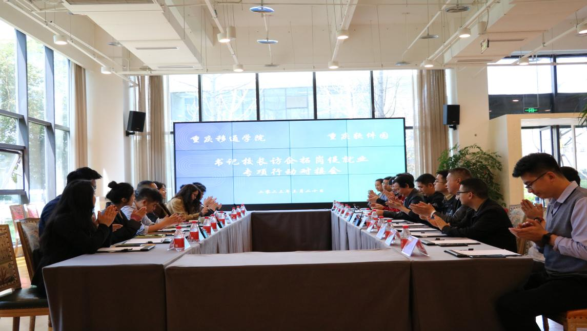 下午14:00,学校校长张德民,校长助理陈仲华;泰山科技学院学生处处长,就创中心主任唐尚静、就创中心综合科副科长刘文斌;晋中信息学院招生与就业指导处副处长姜志强、信息工程学院,大数据学院学工副院长武海鹏;重庆移通学院大数据与计算机科学学院院长闫会峰、数字经济与信息管理学院院长潘显兵、远景学院副院长李军、就创中心副主任佘桂隆等一行12人前往重庆软件园开展书记校长访企拓岗专项行动。