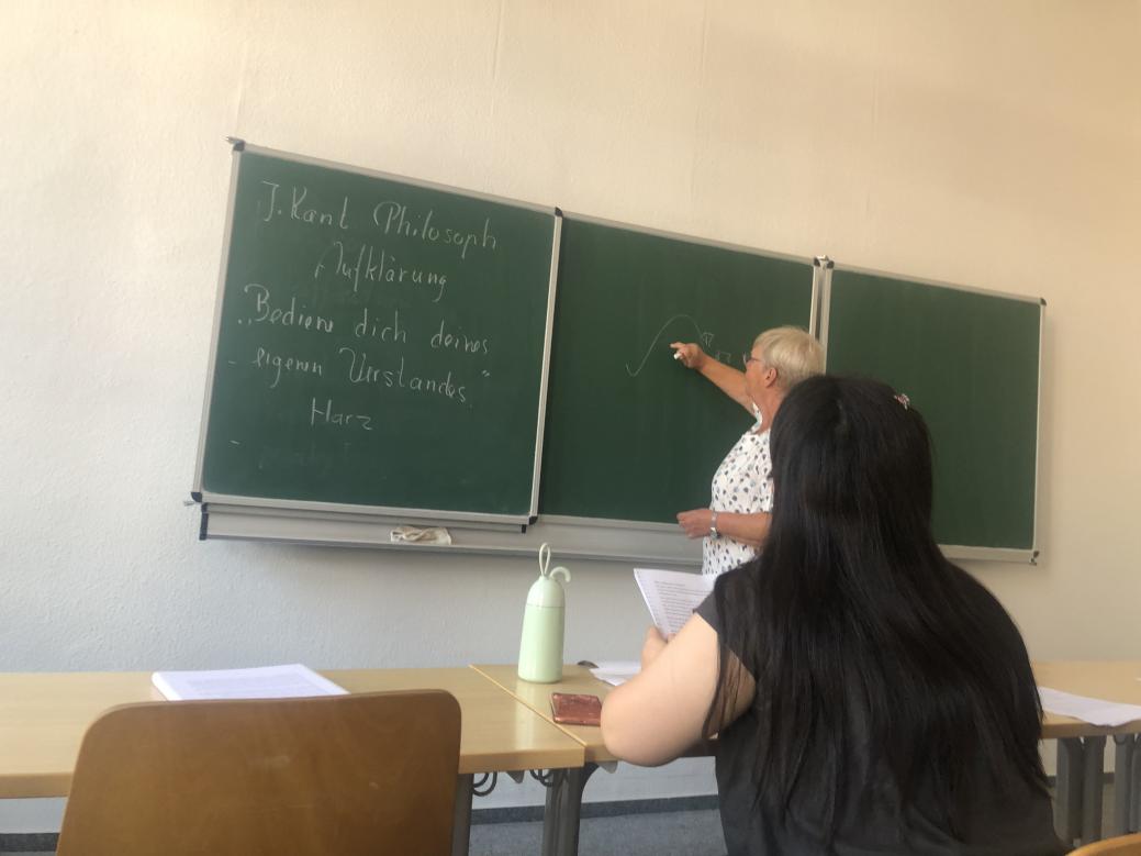 7月26日,移通和河南大学的老师们进行了第一次交流课堂。Frau Haack首先让我们对于德国的文化知识进行交流讨论,从对德国的衣食住行的了解到德国文化历史的研究,我们都进行了积极的讨论。Frau Haack给大家讲解了很多关于德国的有趣的文化知识,也帮助老师们更好更深入地理解德国文化。老师们培训所在的城市也是一个较老的德国城市,拥有着悠久的历史和文化,课堂上也对该城市做了详细地介绍。