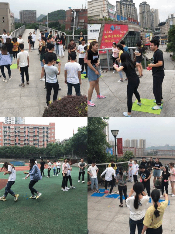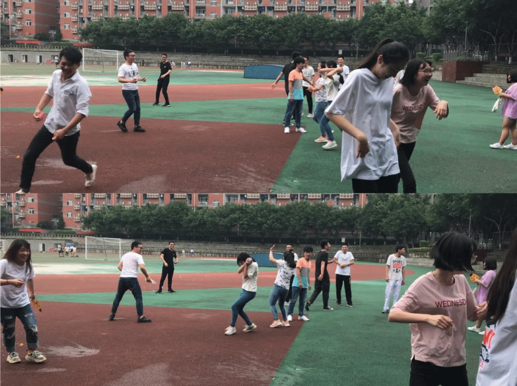 小游戏总共三项,分别设在天梯和通向c区篮球场的路上。第一项是抱球跳绳,队内2人舞绳子,2人抱着水球在指压板上连续跳8个。抱水球的两个同学为了团队的胜利,忍着指压板的疼痛,这就是坚韧的力量。第二项指压板踩气球,刚刚未参加的同学踩完指压板上的所有气球才结束,天梯中传来嘭嘭啪啪的声音,像是新年的炮竹声,除去昨日自己的懒惰。第三项游戏大象鼻子接水球,在头昏目眩的情况下传递脆弱的水球,需要小心翼翼,细心呵护。在游戏区安全区外都是水球抢夺范围,同学们花样百出藏着自己的水球,却常常是螳螂捕蝉黄雀在后,或是渔翁得利或是玉石俱焚,大家在奔跑的过程中就结下了“仇恨”或合纵连横有了目标。同学们在游戏中尽情奔跑,在对重要武器水球的保卫中体会到团结、爱护与坚韧。