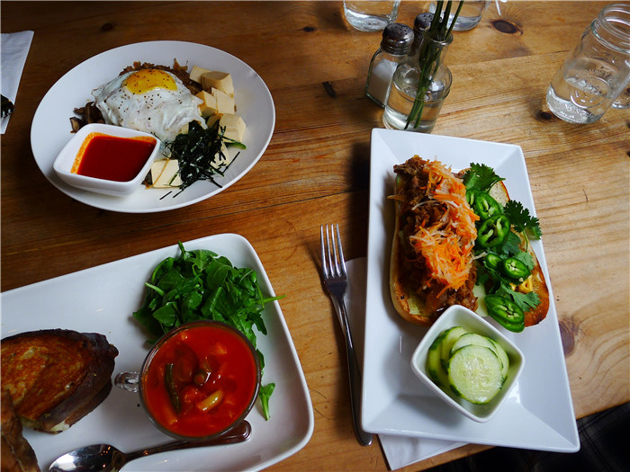 带着这种隐约的期待,我们结束了上午的课程。走过两条街,找到一家不起眼但是很多人就座的餐厅。点餐令人头疼,但是上的美式面包中夹着浓郁的芝士,番茄汤是用微波炉烤过一两分钟后的软糯,清甜。唯一不习惯的大概是小菠萝菜,用柠檬汁和白醋拌着,刺激着味蕾,是我中国式的胃有些受不了的酸涩。凡哥说吃美餐不是为了吃它的味道,仅仅是吃它的体验,不同于每个地方专属的这种体验。这是我们旅行美好的开始。