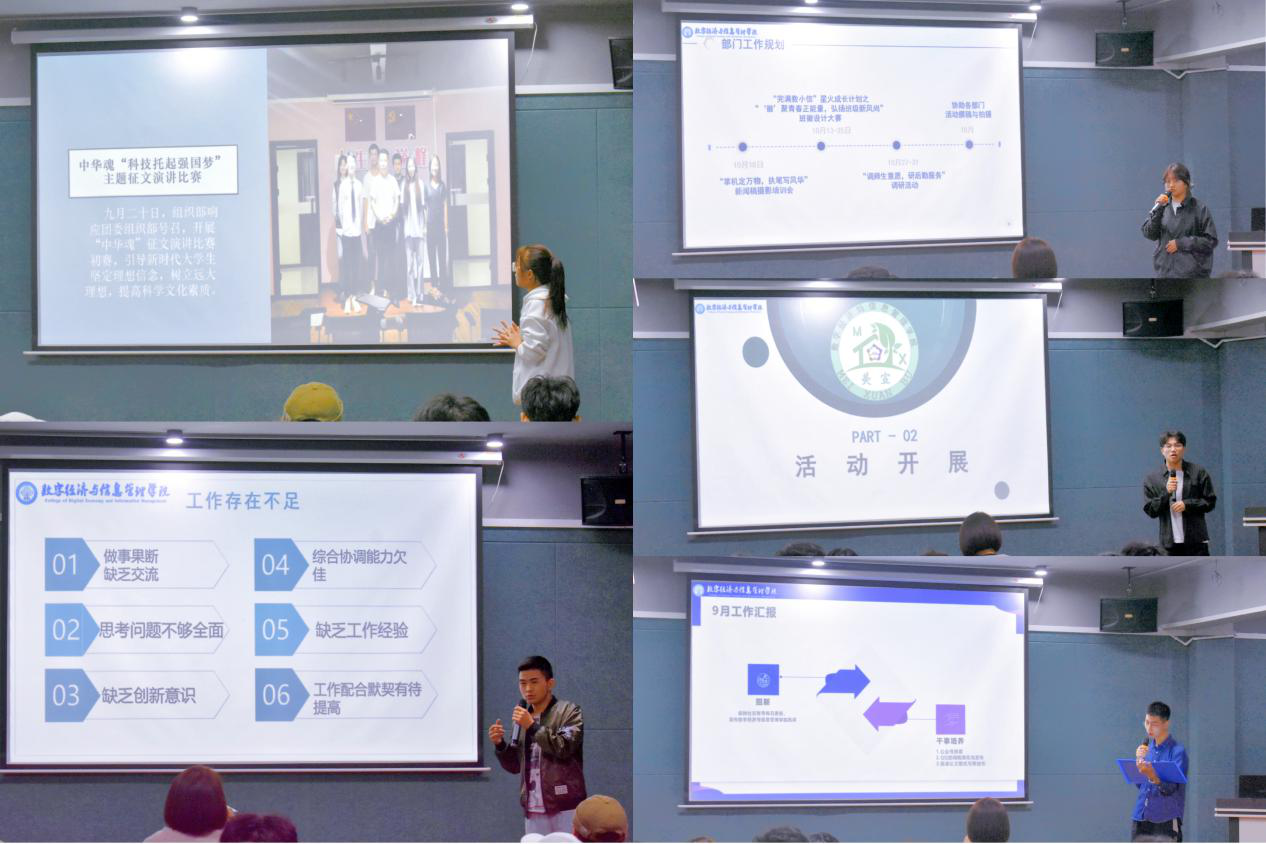 会议第一阶段,各部门部长依次上台对9月工作进行总结,阐述在工作中产生的问题,并对部门的学年工作计划做出了新的展望与安排。阐述过程中,各部门都对在举办活动中出现的问题进行了反思,并提出了解决方案,表示在接下来组织活动时将会更加全面地考虑实际问题;对于活动中优质的部分加以保持和拓展。不仅有各部长对本部门进行系统的规划,任老师更是悉心考虑到各部门的发展,提醒大家注意资源问题并强调部长必须要提高积极性,凡事只有主动多一点,部门才会有更好的发展,完满教育才能够更好地落实。