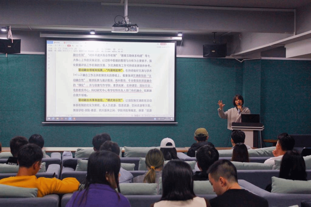 会议第二阶段,任老师从年度主题与定位、工作要点与思路两大板块,向干部们解读了2020-2021 学年目标规划与工作要点。本学年工作将持续坚持以立足学生的全面发展和提升完满教育师生满意度为根本遵循,持续坚持将完满教育“质量提升”和“基层活力”作为主要抓手,持续坚持以“融合·提升·巩固”作为建设主题关键词,全面加强对“联动融合年”和“融合提升年”进行“全面巩固”和“深度延展”。对完满工作目标做出了新的解读,加强对完满四大板块新的建设与规划,着重强调完满教育的“主动融合性”,继续拓展与通识教育、商科教育、专业教育的深度融合的“细化”,并与创意写作学院、素质拓展、名师课堂、国际交流、电影教育中心、科幻研究中心等学校特色育人部门有机融合,拓展融合提升领域。对学生干部的素质和能力也做出了新的考核安排,要求干部以身作则,做好思想引领,带动团体发展,共同勾勒数信蓝图,建设全新数信院。