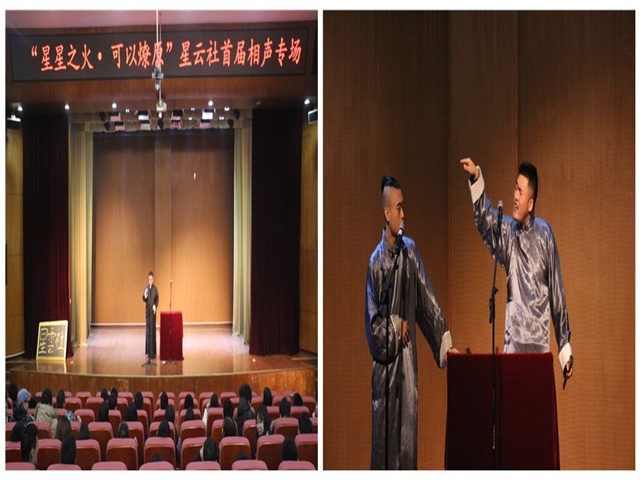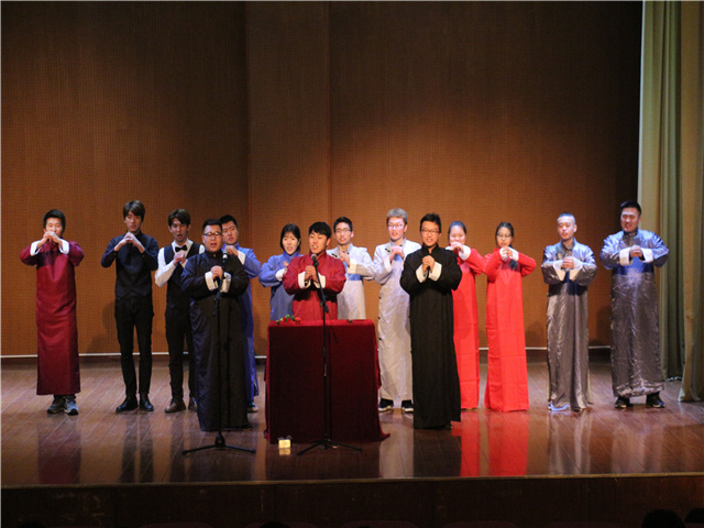 灯光迎头洒下、话筒调好,相视一笑、开腔作势,一颦一笑间,惟妙惟肖,顷刻卷起阵阵掌声。台上的演员酣畅淋漓,卖力表演,台下的观众也听得如痴如醉,大饱眼福。一句“哎呦,这不你辅导员嘛,小心说话哦”迅速的临场反应也在顷刻间俘获了观众的心。这或许就是相声的魅力,不娇柔不做作,完整的向观众展现最真实的表演。天色渐黑,首届相声专场也在全体相声演员的大合唱《大实话》中落下帷幕。台上,镁光灯下,三代社长同台合唱,这一声一语中尽显传承的意味。