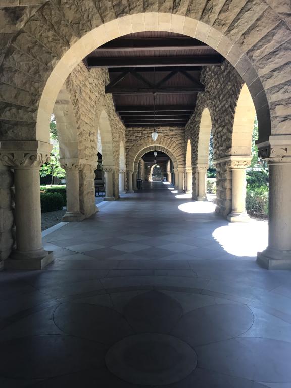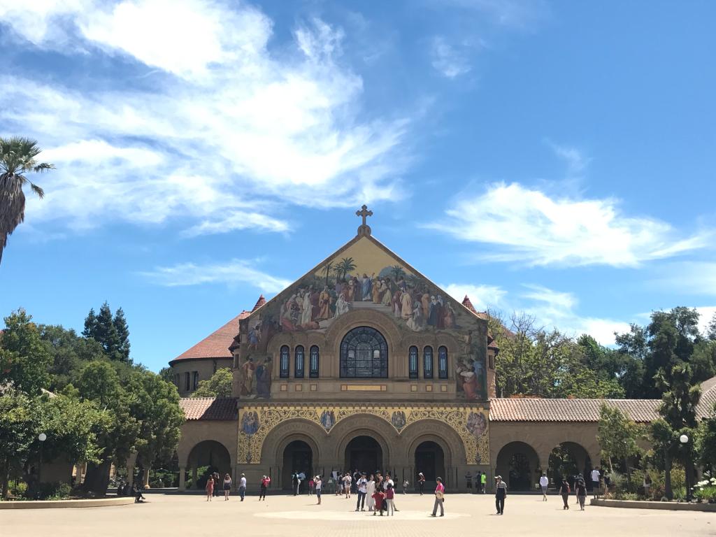 下午我们马不停蹄地前往斯坦福。当开车沿着大学路穿过繁忙的小镇帕罗阿托,过了分割校区和热闹商业区的大道后,看到马路两边高耸的棕榈树成行,静静的校园掩盖在红松树林里。开到路的尽头,视野突然开阔起来,前面是一个巨大的椭圆形草地,修整完好的草地中间,一丛丛五颜六色的鲜花把椭圆中心地带突出起来。过了椭圆形草地,前面一巨大平铺的建筑,西班牙式的四方院,就是斯坦福大学的主校区。