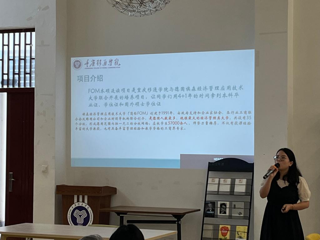 淬炼国际商学院国际专员苏婷老师介绍了埃森经济管理应用技术大学(FOM)本硕连读项目。淬炼国际商学院聚焦打造有信息产业背景、国际化商科思维和视野、社会认可度高的知名国际商科教育平台,通过与国外高校开展国际办学合作,引进国外优质教育资源,为社会培养和造就具有国际视野和胸怀、具备跨文化管理思维和技能、敢于担当和作为的高素质、国际化商科人才。学院与德国最大的经管类高校埃森经济管理应用技术大学展开深入合作,共开设会计与金融管理(Accounting & Financial Management)、国际市场营销(International Management)两个专业,通过创新人才培养模式,成立“德国课程研究中心”、“专家委员会”,在专业发展、课程共建、师资培训、交流互访、交换学习、产教融合、国际论坛等方面持续发力,让同学们享受丰富的国际化商科教育资源,并获得更优质的跨文化成长体验。