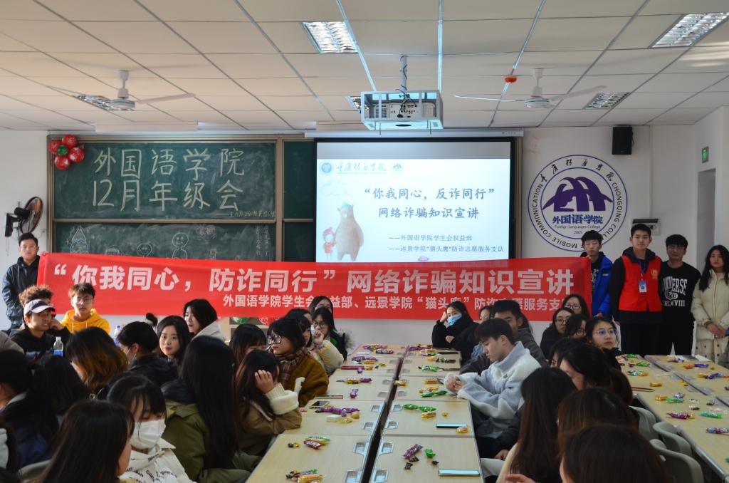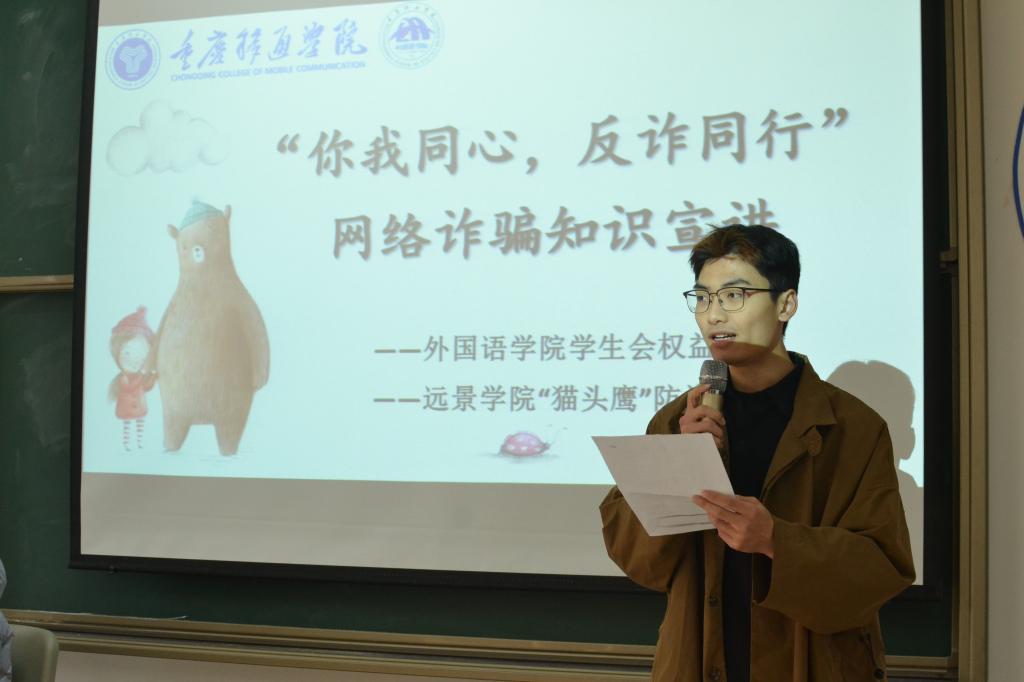 为加强同学们防诈意识,理性应对诈骗情况,保护自身利益。我校外国语学院学生会权益部联动远景学院“猫头鹰”防诈志愿服务支队,邀请远景学院龚喜力学长为同学们讲解防诈骗知识及手段,于2021年12月22日下午3点30分在北校区第九教学楼9106展开以“你我同心,反诈同行”网络诈骗知识宣讲活动。同学们需加强自身防范知识,存有安全隐患意识,防患于未然,时刻保持警惕,让骗子无从下手,保护好自身钱财、私人物品及个人信息等不被侵犯。