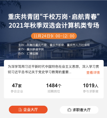 由重庆共青团主办,重庆移通学院就业创业指导与服务中心、大数据与软件学院承办的“双城青才计划——千校万岗”就业服务季活动计算机类线上招聘会于2021年11月24日9:00-18:00在汇博招聘网络平台举办。为了应对后疫情时代高校毕业生的就业压力,为2022届毕业生就业提供帮助,同学们深入了解各个企业招聘岗位,积极寻找自己心仪或与自己专业对口的工作。营造一个良好的就业氛围,推动大学生就业思想的进步,加深学生们对就业的理解,为解决大学生就业问题,使得大学生就业之路得到保障。