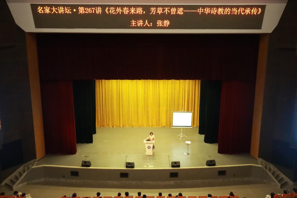 生活不止眼前的苟且,还有诗和远方。中华诗词博大精深,源远流长;三山五岳,巍峨屹立;五谷丰熟,养育万方。一代代中华儿女,在诗词的陶冶下,怡情悦兴,奋发向上。9月22日晚七点南京大学文学博士张静教授做客“文化移通-名师大讲坛第267讲”在缤果大剧院为我们带来以《花外春来路,芳草不曾遮-中华诗教的当代传承》为题的精彩讲座。张静教授带领我们一起走进诗词,在历史的长河中去感受古代诗人的情感,体会中华诗词的魅力,让中国诗教在当代传承。