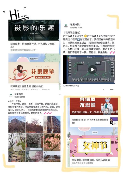 3月3日,花果书院资源拓展部和活动实践部同本部门的干事们开展了一次心与心的交流。资源拓展部的赵晶晶带着小伙伴们举行了“网课学习行为大赏”,在拉近彼此之间的情感距离的同时,也鼓励大家在家也要对自己每天的生活做好规划,以此来适应新学期的学习生活和工作。活动实践部的杨正灏则通过抖音直播的方式跟大家见了面,他以“新起点·新目标”为题和小伙伴们分享了自己的假期生活。新奇的云团建形式在这段特殊时光中温暖着我们彼此,也教会了我们分享和关怀。3月4日,花果书院学生发展导师郭嘉琦老师在钉钉App通过视频会议的形式为花果书院学生自治委员会文化推广部的同学们展开了她的新闻稿与QQ推文撰写培训。