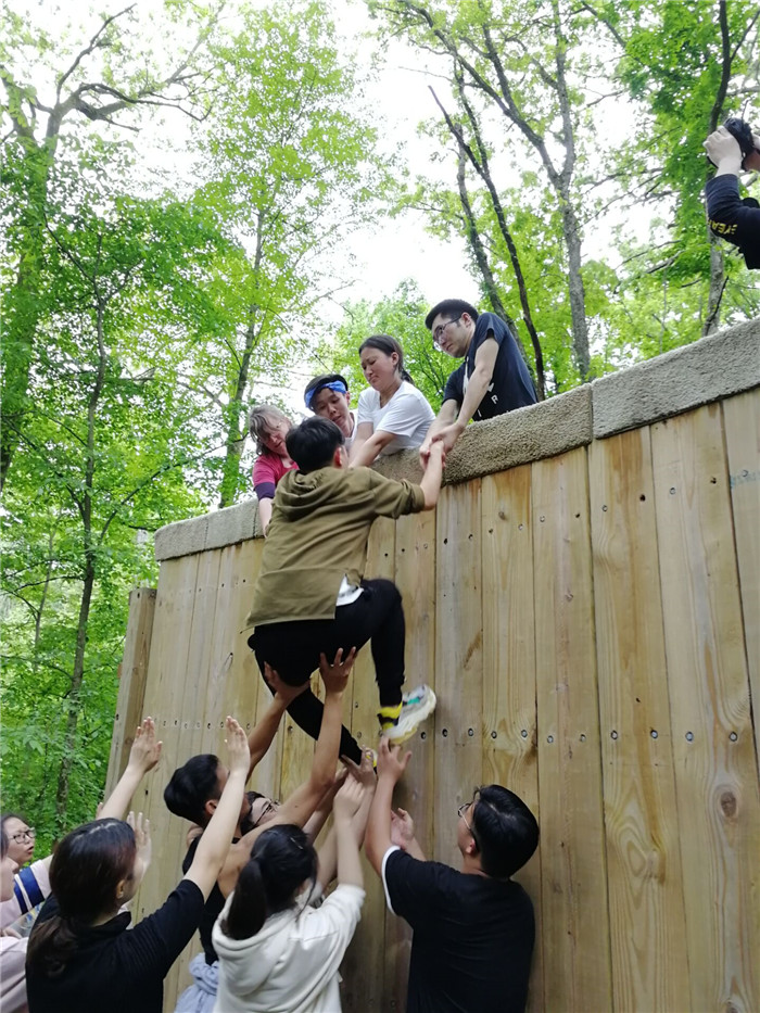 我们搭人墙,把小伙伴们一个一个送上高墙,有的小伙伴自愿在底下被踩,每一个人都努力帮助他人,一起完成任务。每个人都在帮助别人与被别人帮助的过程中突破自己,体会快乐。