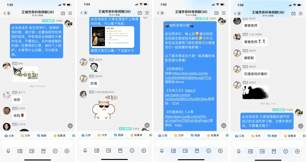 活动最后,导师强调:“疫情管控期间,使用手机、电脑等各种电子设备更加频繁,谨防网络诈骗,要注重保护个人的人身与财产安全,提高防骗意识,疫情管控期间,出现问题要及时反映沟通。”同时为同学推荐一些正能量的励志影片,分享了影片资源,如《风雨哈佛路》,叙述一个真实、努力女孩的人生经历、一段自强不息昂扬奋斗的生命历程,传递给人的除了心灵的震撼,还有深深的感动,非常值得同学们利用课余时间观看。特殊时期,劳逸结合,期望大家以良好心态调剂好学习与生活,共同努力,相信很快就可以漫步在往日宁静而美好的校园。