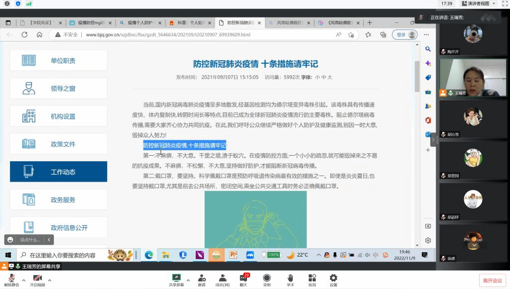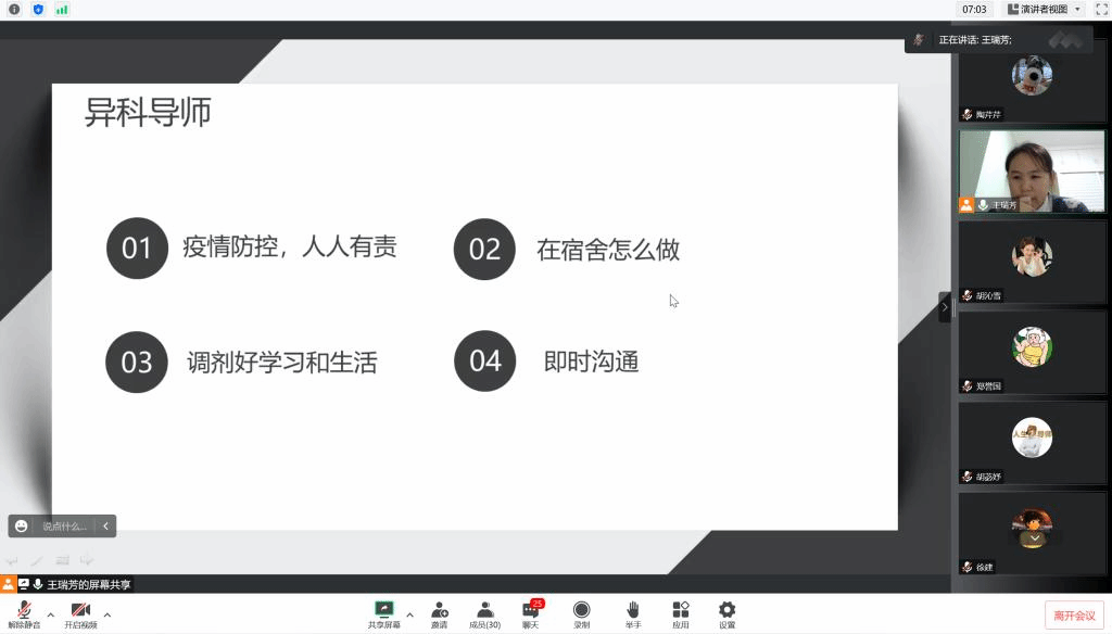 11月8日是学校本学期自开学以来最紧张、忙碌的一天,疫情突现状况,学校实施临时管控,全校联动,“移”心抗疫,各种群消息频频闪动,牵动心弦。为更好发挥异科导师的作用,本着“以学生为中心”的初心,11月9日下午,,异科导师王瑞芳通过腾讯会议与所指导的2022级英语3班的学生开展线上交流活动,主题为:“疫情防控下,在宿舍怎么做”。活动前,导师王瑞芳通过QQ群线上交流,时刻关注疫情管控下同学们的心态。