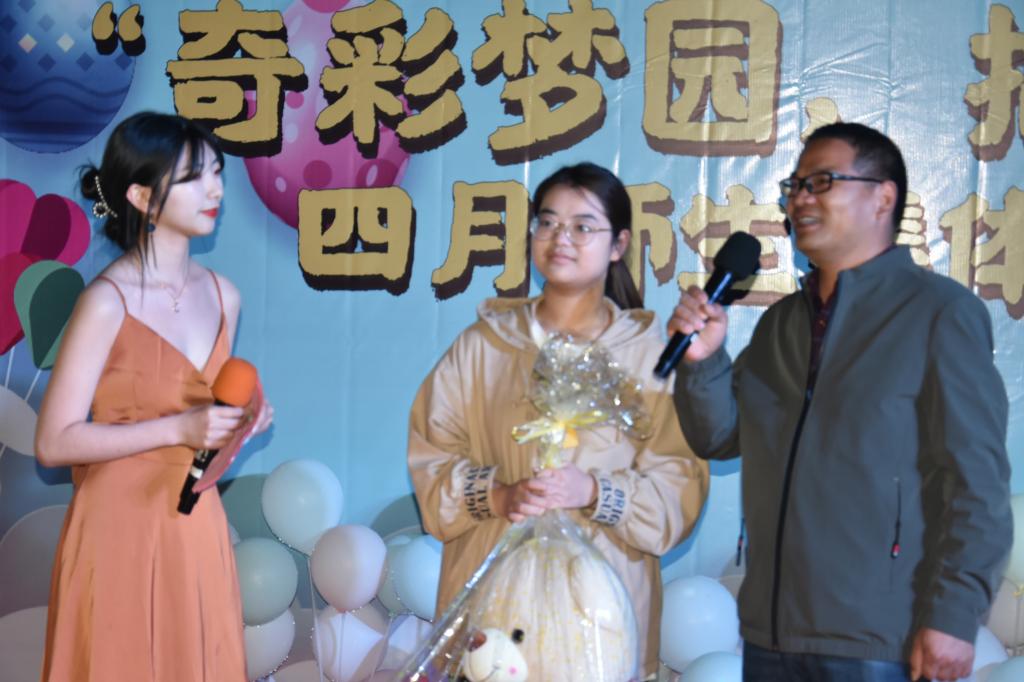 伴随着《父亲》的旋律,一个特殊的嘉宾走上了闪耀的红毯,在师生们的掌声中,黄锦峰先生抱着一个硕大的玩偶一步步走到舞台中间。黄锦峰先生是廊桥书院千禾烘焙坊负责人黄赛男的父亲,他不远万里瞒着女儿来到移通只为给她一份特殊的惊喜,正在千禾烘焙坊忙碌的黄赛男在老师同学们的簇拥下满含眼泪的走上舞台。一句简单的“生日快乐”道尽了一位父亲最朴实的祝福,抱着父亲赠与的生日礼物,黄赛男激动得说不出话来。