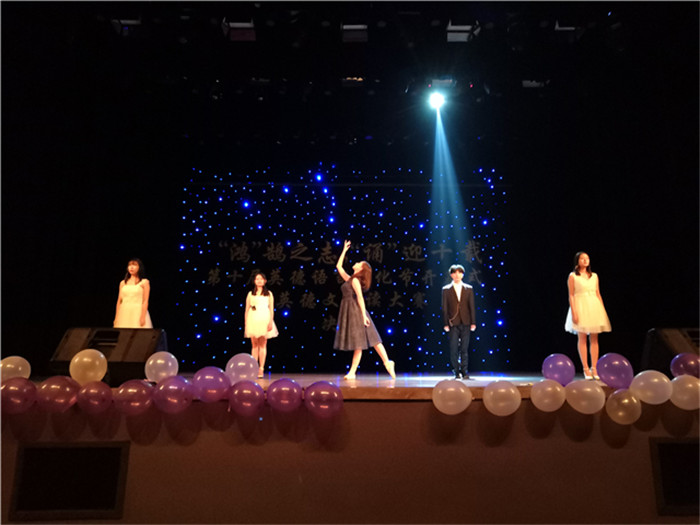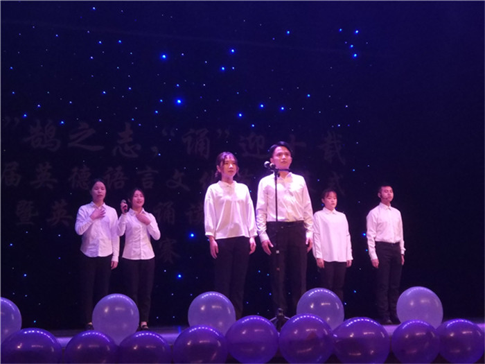 首先由前六组带来表演,淬炼商学院带来"youth",精心准备的道具,让大家在梦境中畅想.由艺术传媒学院带来音乐剧"猫"的片段表演,诵读途中一只“黑天鹅”以翩翩舞姿走进了观众的视野,轻柔的舞步与优美诵读声相互映衬至今让人记忆犹新。如果有人问及谁的诵读像一首歌一样引人入胜,那一定是大数据与软件学院的"音乐之声",一场场经典电影对白,配合生动的舞台表演,悠扬的歌声将观众们带入了电影的记忆中,仿佛身临其境。随着比赛的白热化,前六组表演全部结束,观众意犹未尽的期待中,外语系学生会主席赵鑫向我们介绍了第十届"英德语言文化节"的子活动.再一次将观众的热情点燃起来,后五组的比赛开始了,首先出场的是外国语言文学系英语专业带来"西风颂",观众大声为外语系加油,表达自己对外语系的期待与兴奋。