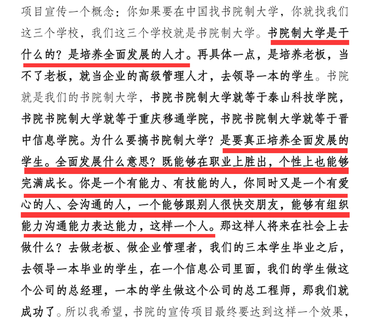 教育需要一种情怀,我们做教育的宗旨是为学生创造卓越的价值。鉴于我们教育的对象是考试能力较弱的普通三本学生,要想最大限度地帮助他们获得成长,我们创新实施“四位一体双院制”的人才培养体系,依托完满教育的四个板块,坚持以全生异科导师等为代表的书院育人模式,致力于将他们培养成为既有知识技能又有高情商的经营管理人才。