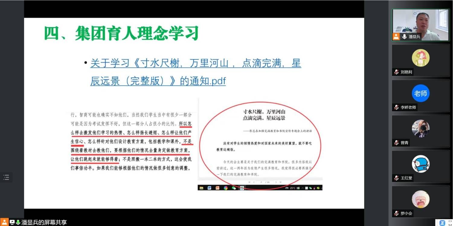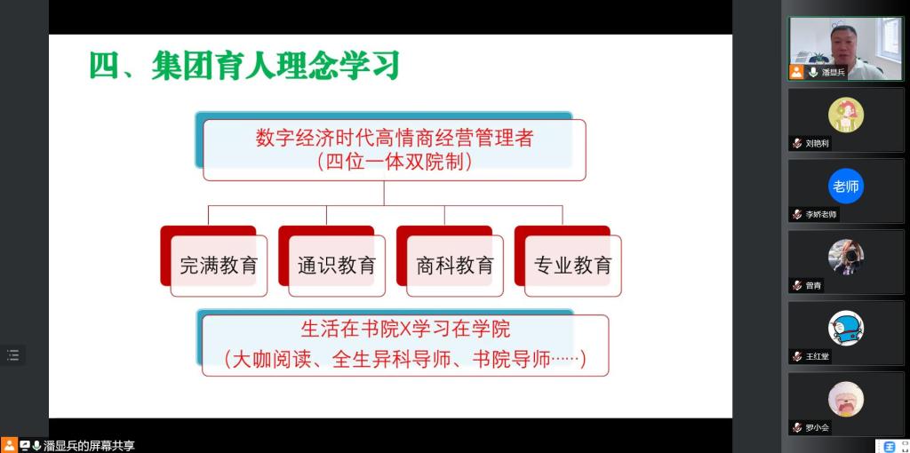 为深入贯彻落实集团总裁彭鸿斌先生在完满教育和书院宣传专题会议上的《寸水尺榭,万里河山,点滴完满,星辰远景》的讲话精神,9月5日下午,数字经济与信息管理学院组织开展线上专题学习会。本次会议由潘显兵院长主持并主讲,学院全体教职工参加。