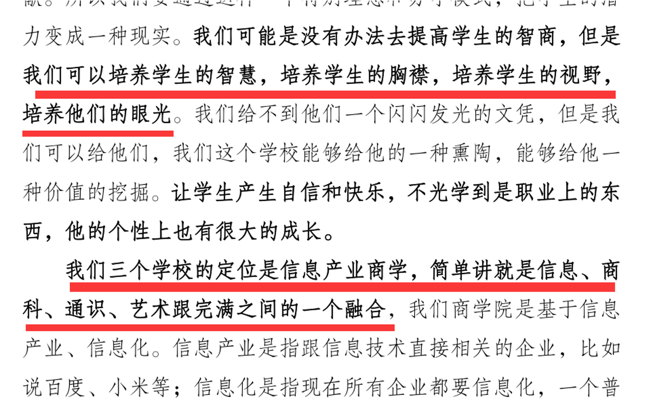 民办教育缺少国家资金的支持,这就更需要我们具有理想主义情怀,真的把为学生的未来发展摆在第一位,培养满足社会发展需要的复合型人才,面对现今的教育困境,我们集团必须更加关注社会市场发展和所需,并灵活变通,培养学生的综合能力,为学生将来的职业发展做好规划,做到社会所需即我们所培养。