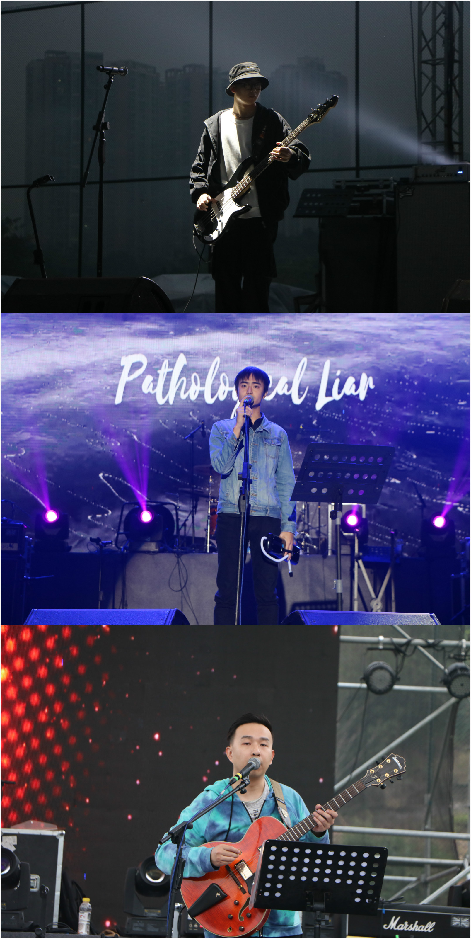 一段动感富有节奏的旋律,主唱、贝斯、吉他在舞台上尽情演唱,吸引了一群观众来到舞台前,他们跟着节拍,摆动双手,摇动身体,陶醉在音乐里。音乐来到高潮,台上主唱闭眼弯腰尽情嗨唱,贝斯吉他放肆弹奏,架子鼓震撼人心,台下观众放声呐喊,跳动欢快,加上灯光的渲染,场面十分和谐。