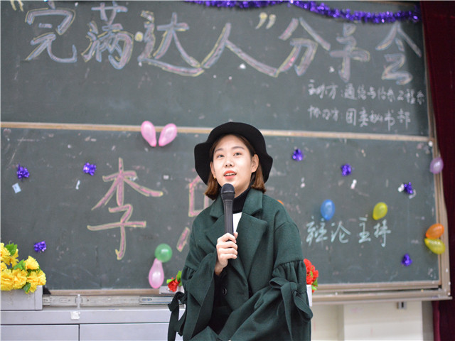 把努力放在当前,让力量彭拜胸间;把希望放在手心,让未来充满美好;把快乐放在心中,让梦想扬帆飞翔。她是演说家,述说人世百态;她是辩手,金口争雄天下;她是主持人,台上光鲜亮丽。这些都是她努力的结果,纵有疾风起,人生不言弃。她,就是本次“完满·达人”——李乐。而学姐的经历对我们说是一种激励,一种鼓舞,从中我们学习到了人总是要逼自己一把,风雨过后才见彩虹。