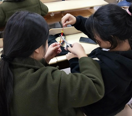 如同召集令般的铃声响过,手工社成员们便踏着轻快的脚步走进教室,“一颗颗诚挚的心”静静地等待着活动的开始。社长带领着社员向大家分发着手工材料。带着表情的瓷珠、不同颜色的编绳不一会儿就摆在社员们身前的桌上。大家“蓄势待发”,就差为接下来的手工“冲锋陷阵”了,兴奋充斥整个教室。