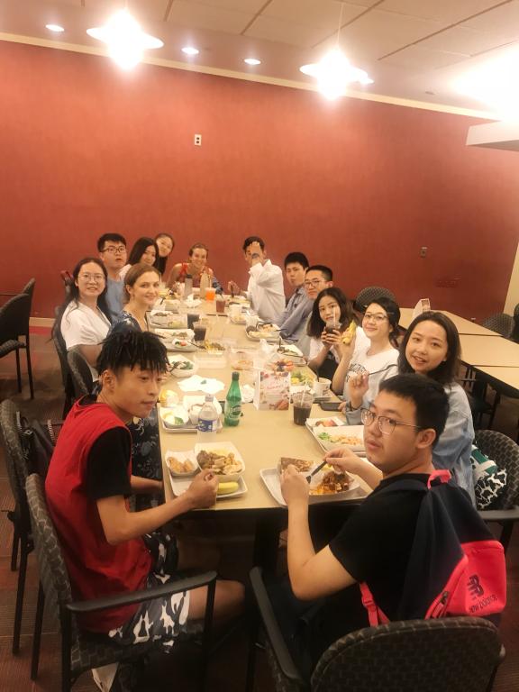 我们集合在教学楼门口,然后老师带队去往用餐地点。有趣的是,在交流过程中老师们还有外国同学对我们中国的火锅特别感兴趣,问我们火锅是什么样的,在纽约有没有火锅。看来我们重庆火锅已经享誉世界了,这是非常值得骄傲的。到了聚餐地点后,我们被眼前这栋大楼所吸引,我们以为是高档餐厅。结果进去发现它里面并不是餐厅。里面是由各种各样的食物拼凑在一起的,我们拿好食物就开始就餐了,在吃饭过程中,我发现老师们大多数拿的是蔬菜,肉类很少。我问了其原因,老师说其实你看很多美国人很胖,不过现在我们越来越重视均衡饮食了,对于她而言,汉堡以及很多快餐都是不健康的,不适合去吃的。反观我们,拿的都不太健康。 最后,我们愉快的结束了用餐,并且对彼此国家的文化也更加的了解。