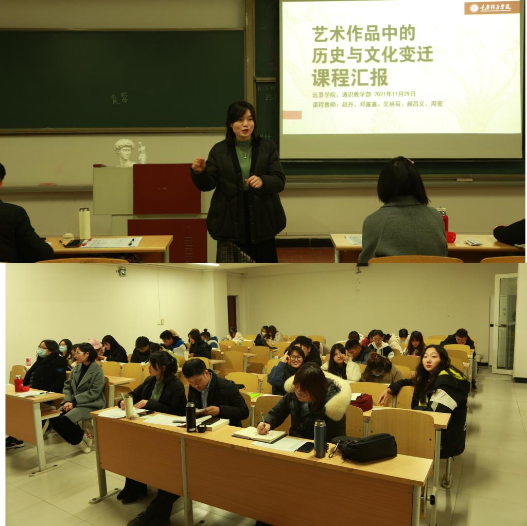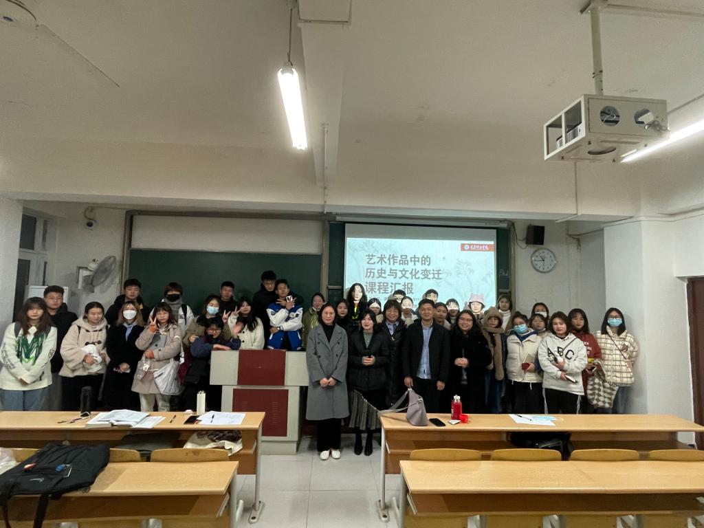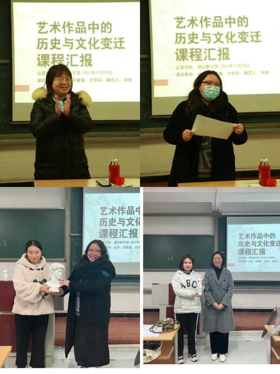 《艺术作品中的历史与文化变迁》课程是面向全校大一本科生开设的,旨在提升学生人文艺术素养的一门新生研讨课。11月29日晚上7点,本学期最后一堂研讨课在7405教室拉开了帷幕。学生进行课程汇报——课堂陈述+作品展示;主讲老师赵丹担任主持,课程组老师:邓露露、颜昌义、吴慈荷以及周密参加本次课程并担任评委。