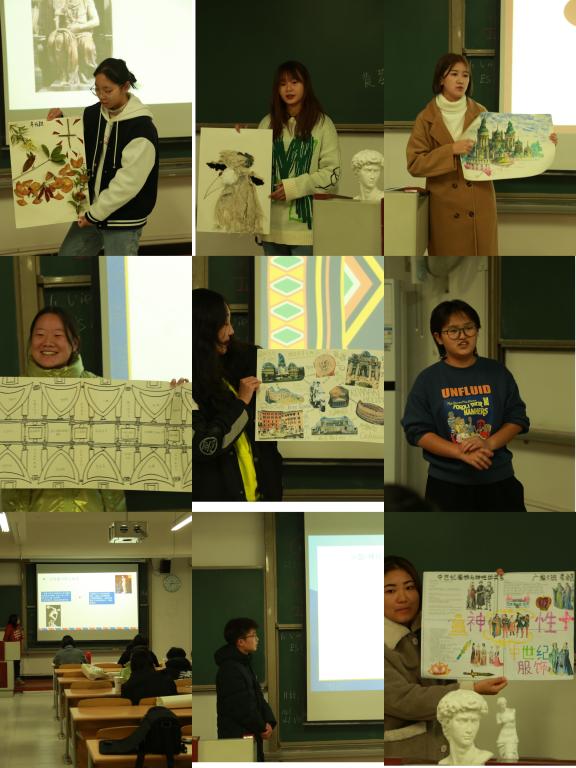 按照课程要求,课程汇报分为6个小组,每组成员共同完成该组的课堂陈述,且每位同学展示自己的作品。老师和同学们共同参与课程汇报的评价,根据评分结果最终产生一位最佳陈述者和最佳作品奖,分别获得雕塑奖品。按抽签顺序,首先是第五小组带来了主题为古希腊神话故事对西方文明的影响,5位同学分别从艺术作品、语言文化、文艺复兴、哲学等方面分析古希腊神话对这些领域的影响;第六组围绕文艺复兴的发展历程从文艺复兴的原因和背景、文艺复兴的内涵及文艺复兴的成果三个方面展开论述;第一小组分享的是古罗马建筑及其影响,通过同学们的分享也让大家再一次欣赏到具有古罗马特色的几个建筑如戴克里先宫殿、阿德良拱门、古罗马五种柱式等,尤其是圣家族大教堂的介绍,讲解的同学非常细致;第二小组解析了米开朗基罗的《创世纪》天顶画,将创世纪分解为五小图、四大图、十二先知及其余部分展开讲解,同时还对创世纪的作者、创作背景进行了深入分析;第四小组分享的是哥特建筑,分别介绍了哥特风格的历史渊源,各个国家的哥特代表建筑物;最后出场的第三组,主题是中世纪及文艺复兴艺术作品中的神性,分别介绍了中世纪及文艺复兴时期服饰、绘画、建筑等具体作品中蕴含的神性。