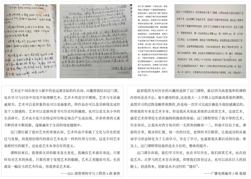 大家在一片欢声笑语中结束了本学期的新生研讨课。通过研讨课的学习,同学们深刻地认识到了人文艺术通识课程的价值,同时提升了自主学习能力、跨学科认知能力、美育实践能力。