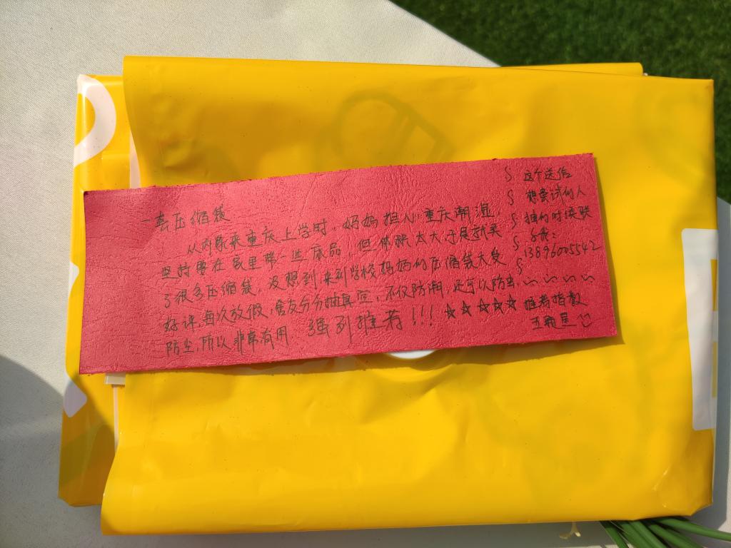 简单方便的压缩袋虽然压缩了行囊,但其中却包含着一位母亲对孩子深沉而细腻的爱,这份爱也陪伴着远在千里的孩子,同时也传递给了孩子的舍友们。独自在异乡,爱却永存!