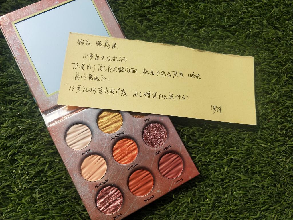 九种颜色,十八的年华,眼影盘的配色在阳光的照耀下变得更加闪闪发光。今年的双十一恰逢她的十八岁生日,她的闺蜜为她购置了这个眼影盘,十八岁,多么美好的代名词,在这青春洋溢的年纪里,与她相识13年的好闺蜜送给她第一份成年礼物——不管未来有多遥远,成长路上有我同行;不管道路有多艰难,愿你永远如太阳般闪耀!