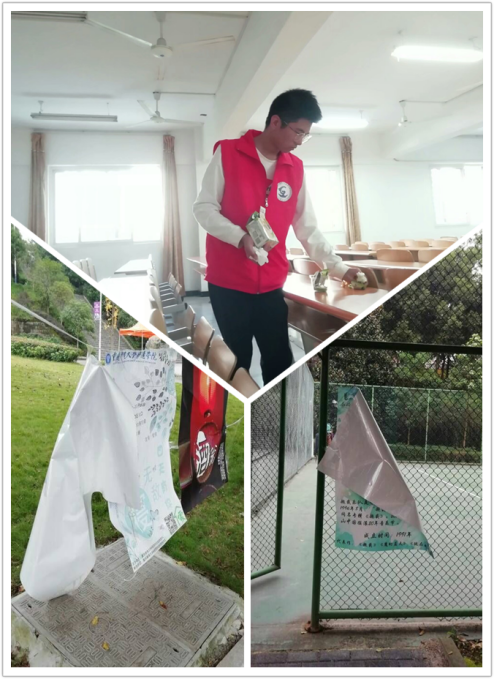 当志愿者们走进教室,教室的地板上、桌子上零零散散地堆积着早餐袋、纸屑以及食品盒子,仿佛写着‘某某到此一游’的字据。秋风阵阵,校园马路两旁的海报正相互厮杀在一起,发出彼此狰狞的怒喊声。那一张张悬挂着的海报,本应整整齐齐地排列成为校园中一道亮丽的风景,却大多由于无人问津,严重脱落,或由于宣传时限已过而占用着大量的宣传空间,使得校园内海报的张贴变得拥挤,让海报本身缺少了原有的“美”,成为了另一道“风景”。面对这样的校园环境,你还允许它维持现在的模样吗?