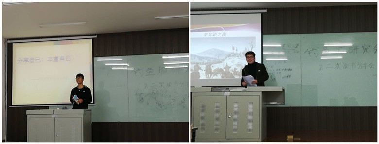 分享会中,同学们踊跃发言,真诚交流,敞开心扉述说自己的读书故事。学术部部长刘浩然同学酷爱战争史,为大家分享了书籍《战争史》,他从明朝的衰败到清朝的崛起对大家进行讲述。一本以战争为线索而串联起来的书,思考人类社会发展脉络,在书中的世界完美的诠释了“顺者以德服人,逆者以兵临城。”沧海桑田,每一个朝代的兴衰更替,总是伴随着这些血与泪的印记。