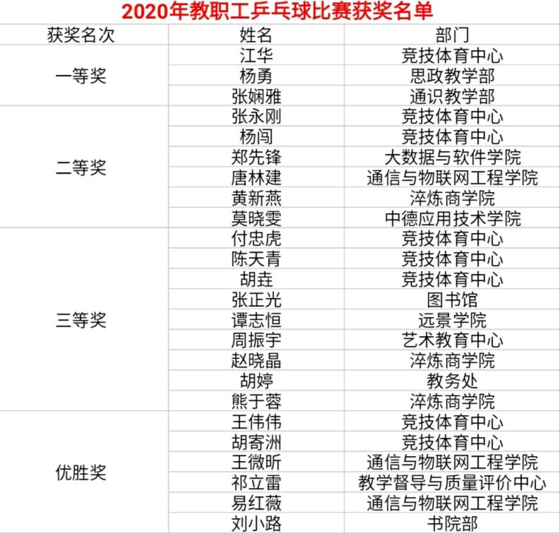 为进一步落实学校新冠肺炎疫情防控工作方案要求,全面提高教职工的体育水平,增强教职工的身体素质,推动我校教职工体育运动的发展,增进教职工友谊,给学生起到良好的带头作用,营造积极向上、健康和谐的工作氛围。教工之家工会委员会特举办2020年教职工乒乓球比赛。