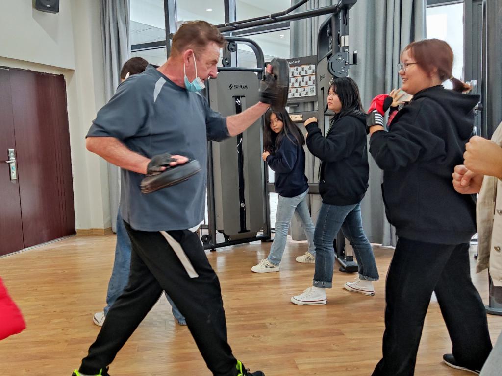在开合跳、收腹跳一番热身活动之后,Mike与在场的老师、同学们开始学习拳击的相关动作,“身体虚晃(Body feint)”,Mike讲到:这个动作是为了在拳击运动的过程中保持身体平衡,防止摔倒和受伤。接着便是“出拳”,出拳分为钩拳(hook)、上钩拳(hook up)、刺拳(jab)、下击拳(chop),Mike分享到出拳要“fast,accurate,fierce”,“转体,吐气,找到合适的角度......”Mike一边指挥学生的出拳姿势,一边大声呼喊。在Mike的指导下,同学们有序进行着出拳和步法训练,虽然当天室外气温很低,但大家依然对这项运动充满了热情。