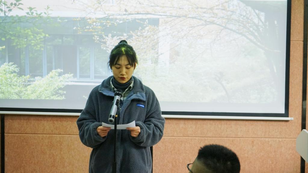 杨老师落座后,同学们鼓足勇气陆续登台放声演说,或紧张,或恐惧,或脱稿,或朗诵,同学们演说后表示,在参与“Speak-uppers”移通演说家之前,普遍都对演讲心生恐惧,并且认为自己并不适合演讲,或者没有这方面的天赋,对学好演讲这件事一点信心都没有。金鑫老师与杨沁霏老师在每位同学演讲结束之后,从不同角度给出了建议,对同学们的走姿、站姿、手势、表情、口语发音一一指导,针对多种话题如何设计演讲稿提出具体解决方案。如“Firstly, on one hand, on the other hand, on the contrary, what’s more, to some extent, to conclude, in summary”等逻辑词汇要活学活用;建议大家形成爱好者圈层,多模仿名人演讲,自发组织每日的英语演讲晨读;通过录音的方式检验自我语音语调的准确度等。希望同学们在不断的练习中提升语言组织、表达能力,思辨能力,激发对思辨的兴趣,学会主动思辨。若能在“演说”的过程中与观众进行心灵上的交流,产生灵魂上的思考与内心的共鸣,那这次的演说就是成功的。