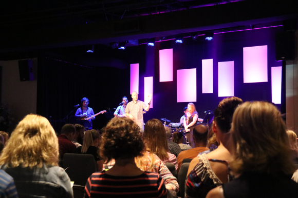 演讲结束后人们手里开始传递一个黑色的帽子,我看到人们都在往里面放东西,继而又传给身旁的下一个人,听Dave介绍那是教堂的捐赠。在捐款结束后,台下的乐队又奏起了音乐,大家都站起来了,开始唱歌,我和Mia都是第一次听到这些歌,其中也有一些生词,可是好在旋律简单能轻轻跟着和上。这样的情节不禁让我想到憨豆在教堂里唱歌的情节,他只会唱“阿里路易亚”,一唱到这句时,他就大声地唱,过了这句,就只是小声哼哼,这情景跟此刻的我和Mia出乎意料的神似。