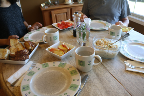 Lily在回家的一路上就询问我们喜欢吃什么口味的食物,认为美国食物如何,有什么不适应的。很快,Lily的午餐也准备完毕,虽说不是太丰盛,可是却让人吃得很开心。了解到我们在国内一般和热水和茶,午餐时她贴心的为我们准备了热水以此代替了大多数美国人偏爱的冰水,鸡肉沙拉和烤面包真是让我爱不释手,热水喝到胃里暖暖的,心里也暖暖的。