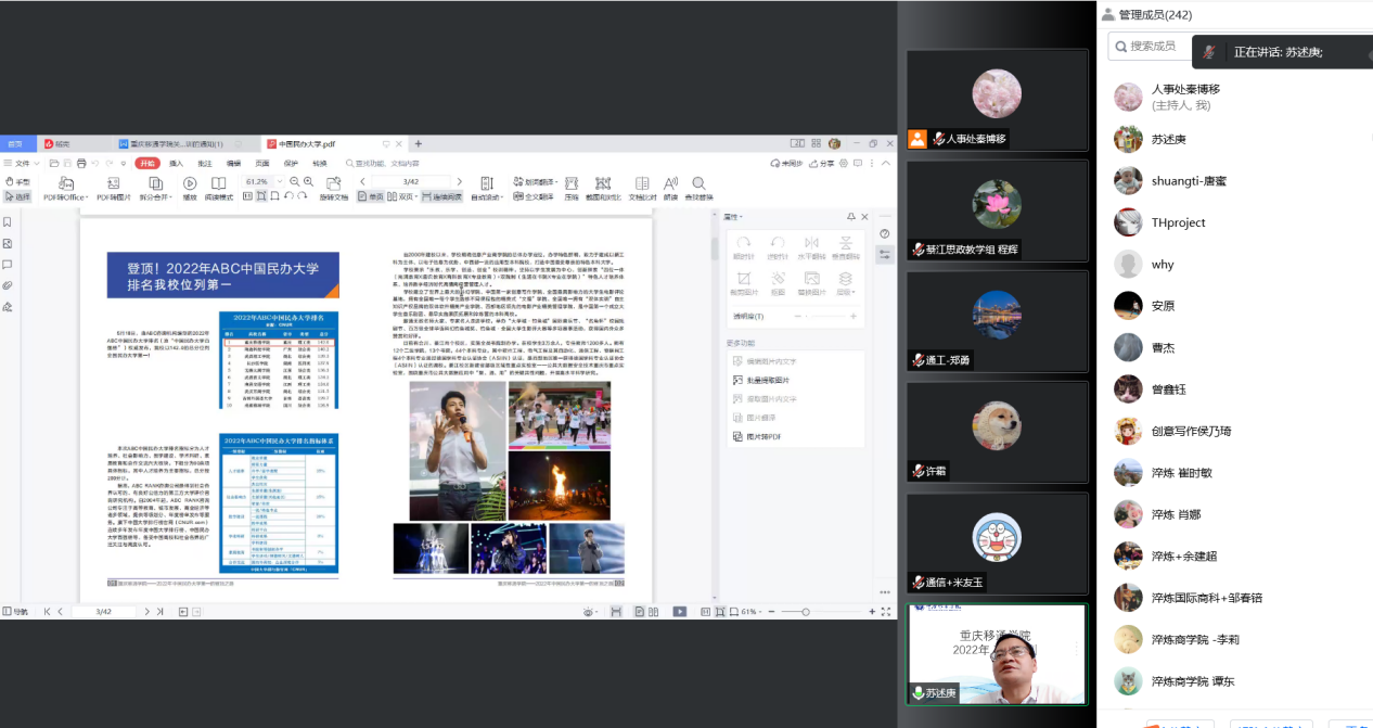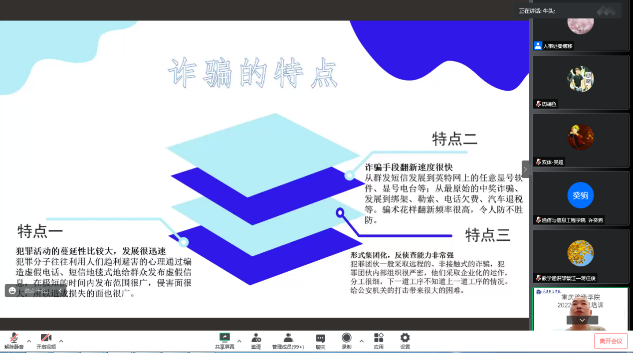 三是基本技能的提升。宣传新闻中心主任苏述庚老师进行公文与校园新闻写作培训,让教师了解并学习公文写作的格式与要求,怎样做好一名优秀的校园工作者,以及如何写好校园新闻稿、做好品牌营销。网络与信息管理中心宋秋霖崔向灵两位老师分别就合川、綦江两校区的多媒体教学设备的正确使用方法、学校OA系统、指尖移通小程序的登录使用做了详细的培训,为新入职教师在教学硬件和软件的使用上做了技术指导。财务处的陈玲和聂定燕两位老师对财务报销制度及金蝶费控系统操作流程做了详细的讲解,教务处学籍管理与考试中心副科长杨旭老师对学籍与考试管理做了培训。教务处教务科科长卢中玲老师为大家培训了教学管理与相关制度解读。学生处学生科科长熊斌老师对学生管理相关制度及教师对学生的管理方法做了分享与引导。保卫处彭洪处长对消防安全和防诈骗做了培训,谨防各位老师受到电信诈骗并能够对学生做防诈骗知识的宣讲。