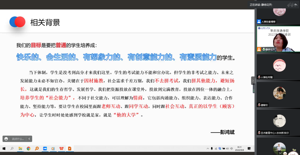 为深入实施人才强校战略,提升新聘教职工的职业素养和综合素质,增强职业使命感、荣誉感和社会责任感,引导新教师以德立身、以德立学、以德施教,9月6日-9日,人力资源处组织了为期4天的入职培训,由于受疫情防控的影响,本次培训采取线上进行。