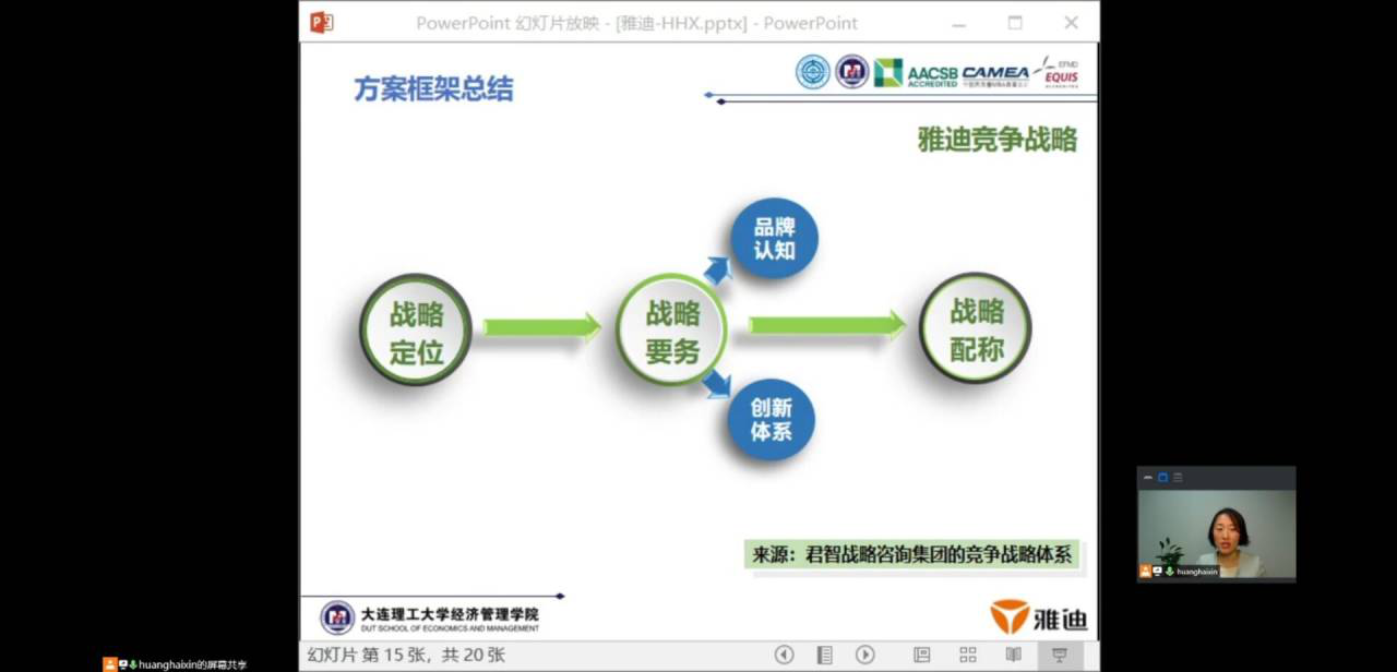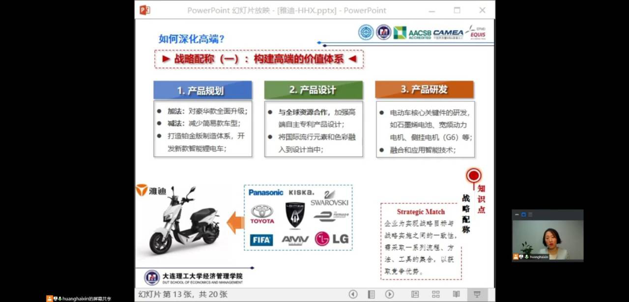 随后,黄海昕副教授与全国许多高校的学生进行了线上交流分享,就雅迪公司的战略定位等问题进行了热烈的探讨,其话题讨论的重点在于雅迪究竟是应该“重兵低端”还是更应该“深化高端”?各高校学生均采用PPT的形式进行汇报,领导力教研室的老师们也在观摩案例行动学习课程的过程中就案例本身以及学生的汇报内容进行了激烈的讨论。
